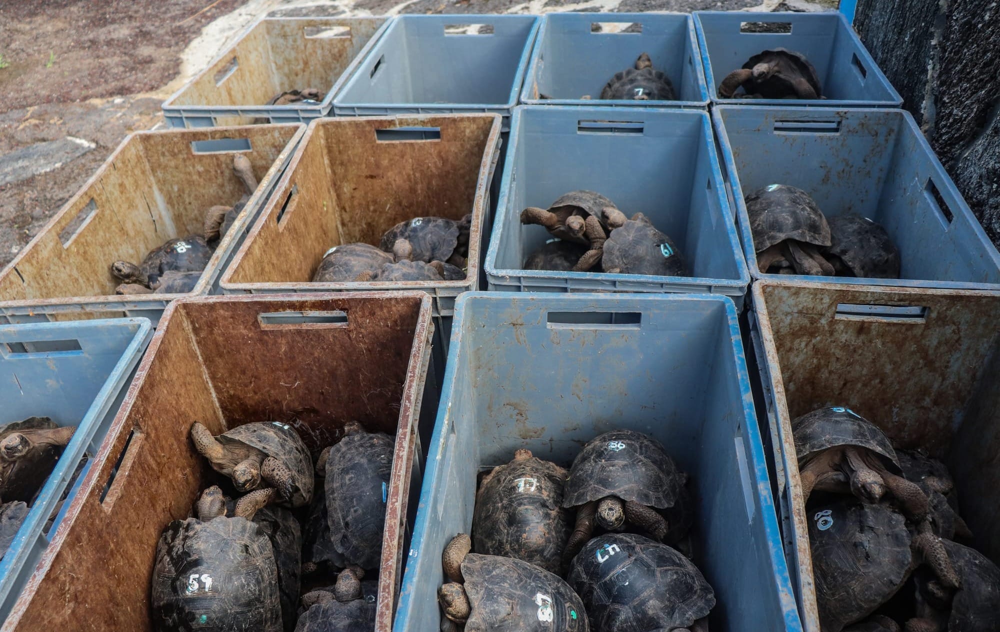 Tortugas gigantes juveniles de la especie Chelonoidis vicina fueron llevadas desde el Centro de Reproducción y Crianza "Amaldo Tupiza Chamaidán" hasta su hogar natural en Cinco Cerros, en la Isla Isabela, Galápagos.