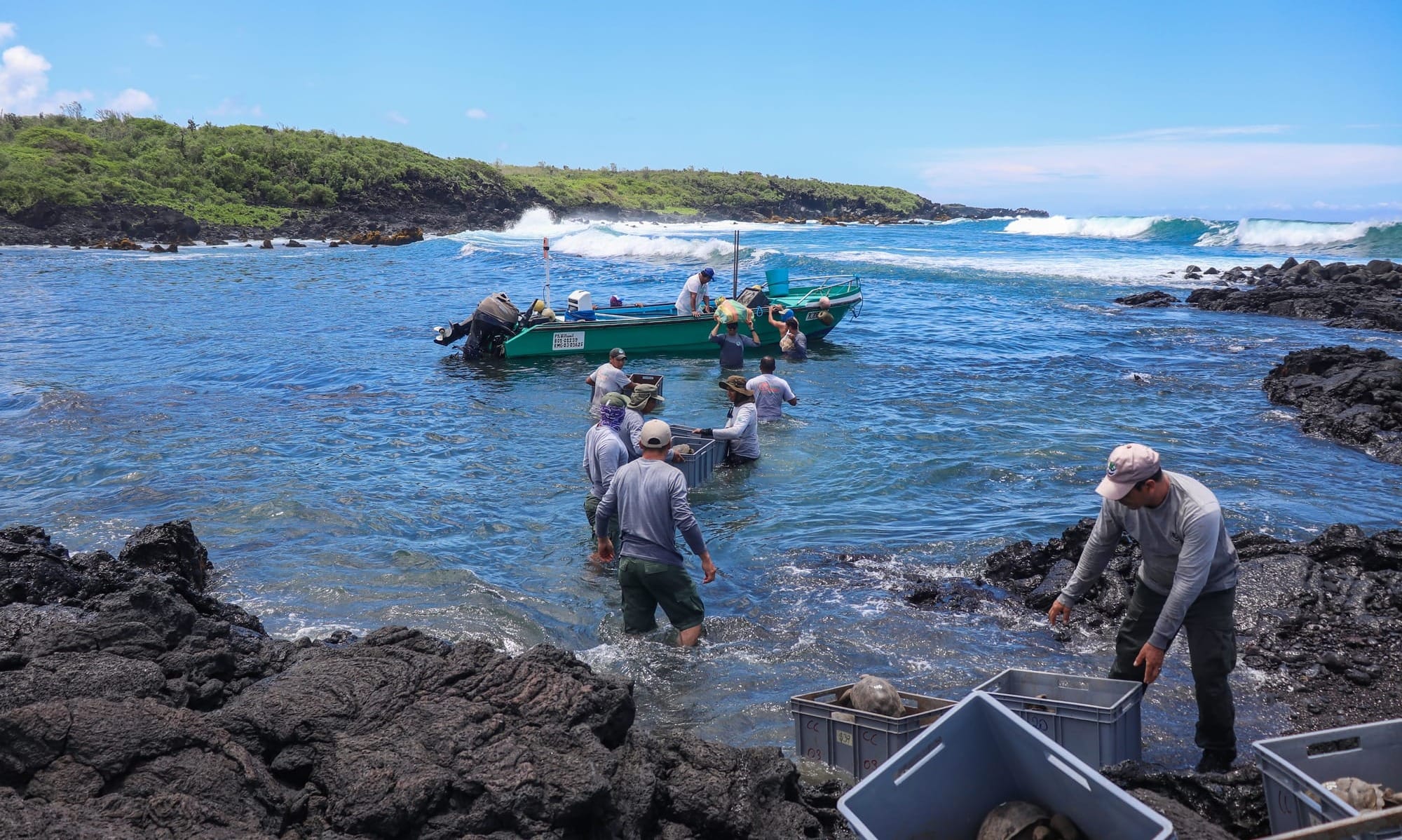 Tras una hora de navegación en lancha rápida, los técnicos desembarcaron la valiosa carga con el apoyo de una nave pesquera y caminaron cinco kilómetros en terreno agreste, informó la Dirección del Parque Nacional Galápagos (DPNG).