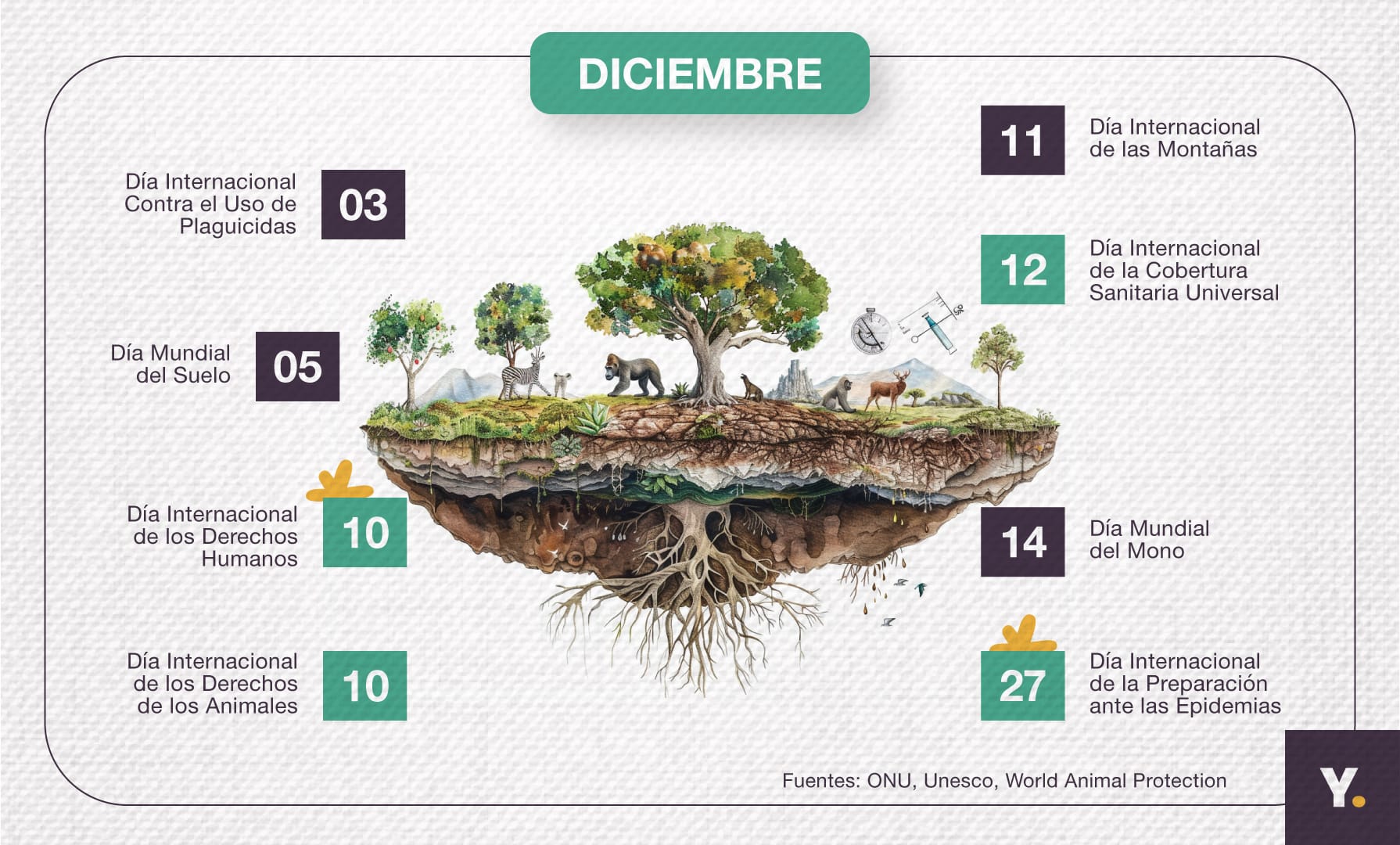 El 10 de diciembre, Día Internacional de los Derechos Humanos; el 10 de diciembre, Día Internacional de los Derechos de los Animales; el 12 de diciembre, Día Internacional de la Cobertura Sanitaria Universal; y el 27 de diciembre, Día Internacional de la Preparación ante las Epidemias, una jornada para reflexionar sobre la importancia de fortalecer los sistemas de salud, proteger a las comunidades y promover un enfoque integral de bienestar y sostenibilidad.