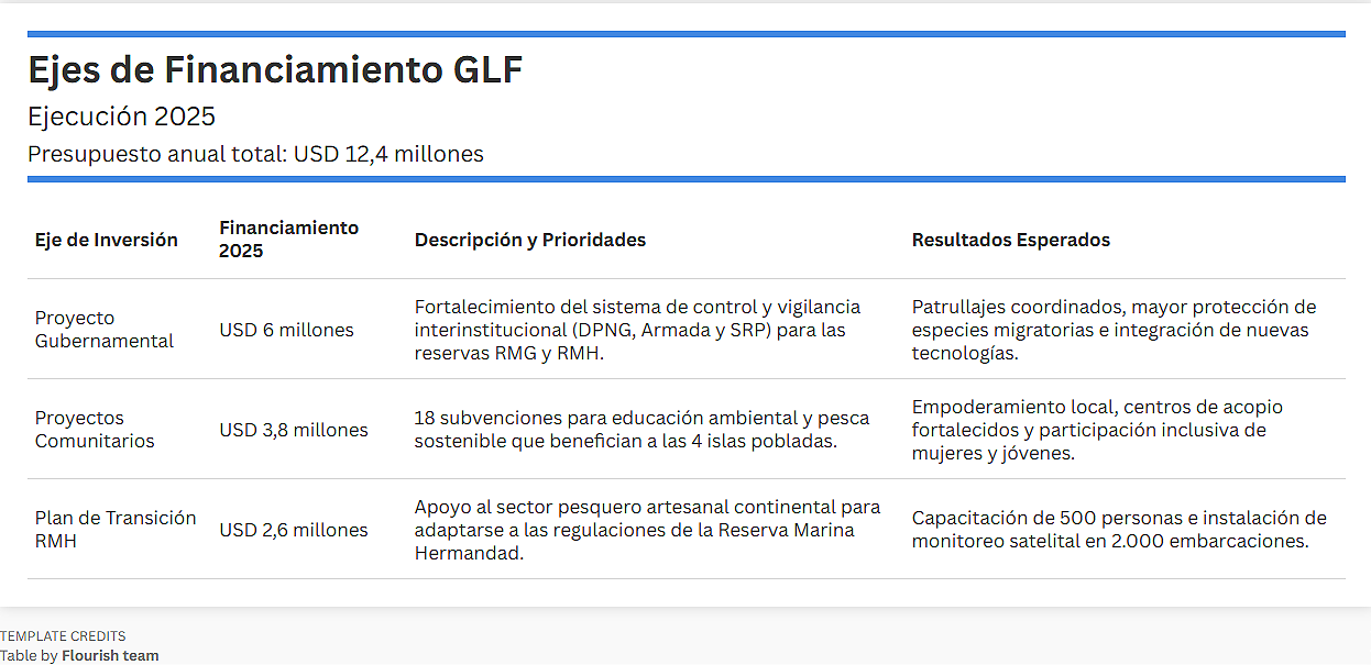 GLF es un caso especial. Fue el complemento financiero a la creación de la Reserva Marina Hermandad (60.000 km2, aproximadamente), que se agregó a la Reserva Marina Galápagos (alrededor de 140.000 km2).