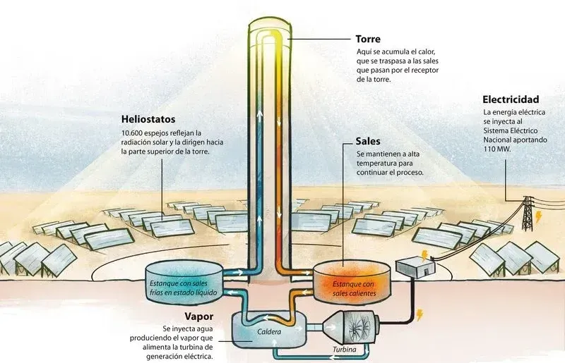 Esta tecnología ha tomado fuerza en el debate chileno, ya que en el país se instaló la primera planta termosolar de América Latina, el Complejo Solar Cerro Dominador, que consiste en un parque fotovoltaico y una concentración solar de potencia (CSP) que permite almacenar energía a través de sales fundidas.