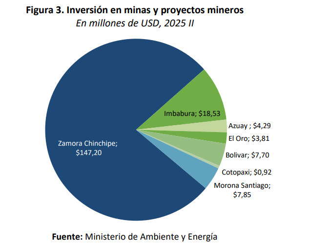De acuerdo con el Viceministerio de Minas, hasta el segundo trimestre de 2025, la inversión en minería industrial ascendió a USD 190 millones. Se concentraron en la mina Mirador, con USD 96 millones, y en Fruta del Norte, con USD 51 millones, ambas en la provincia de Zamora Chinchipe.