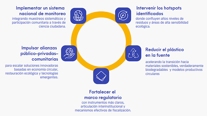 Hace un llamado a mejorar los sistemas de gestión de residuos: mayor inversión y tecnologías limpias. Así también, la adopción de una economía circular inclusiva, sistemas de trazabilidad e impulso a materiales verdaderamente biodegradables.