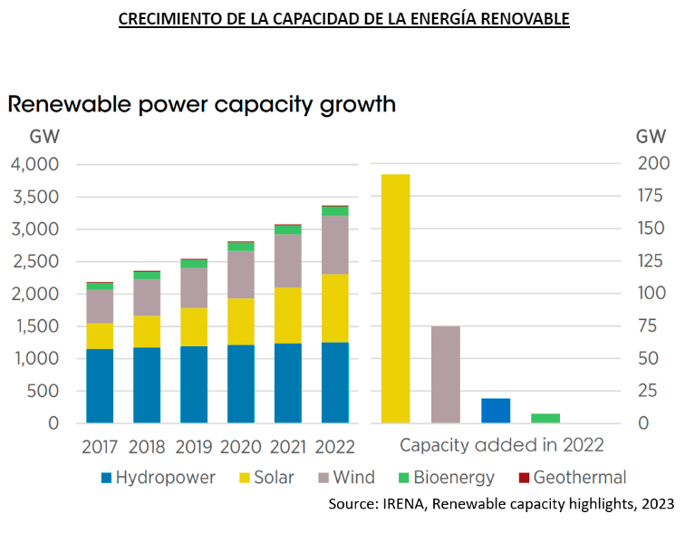 La capacidad de generación renovable aumentó en 295 GW (+9,6%) en 2022.
