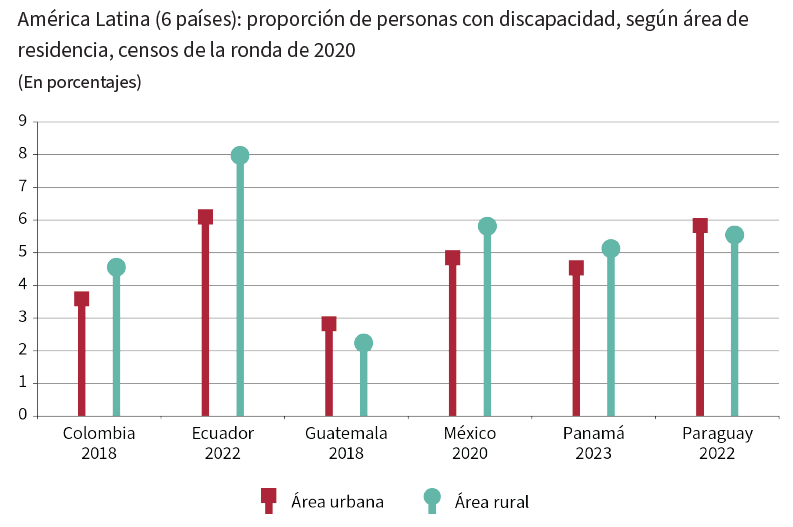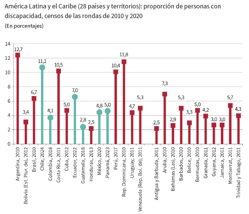 En el estudio se hace notar que, en América Latina y el Caribe, las personas con discapacidad representan un grupo muy importante de la población. Alrededor del 6,5% de la población tiene algún tipo de discapacidad, según los datos de los países que realizaron sus censos en las rondas de 2010 y 2020.