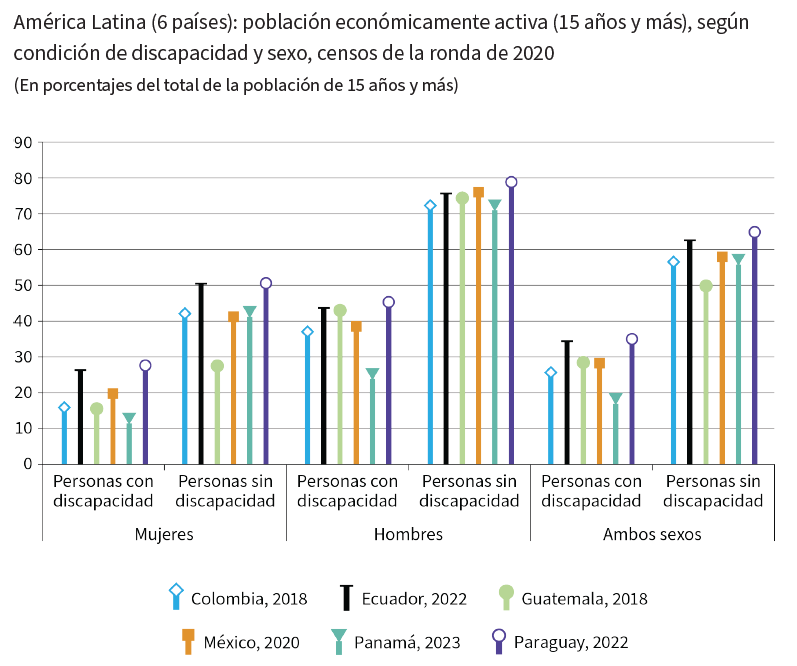 Según datos censales recientes de algunos países de la región, menos del 40% de las personas con discapacidad forman parte de la población económicamente activa, en comparación con alrededor del 60% de la población sin discapacidad.