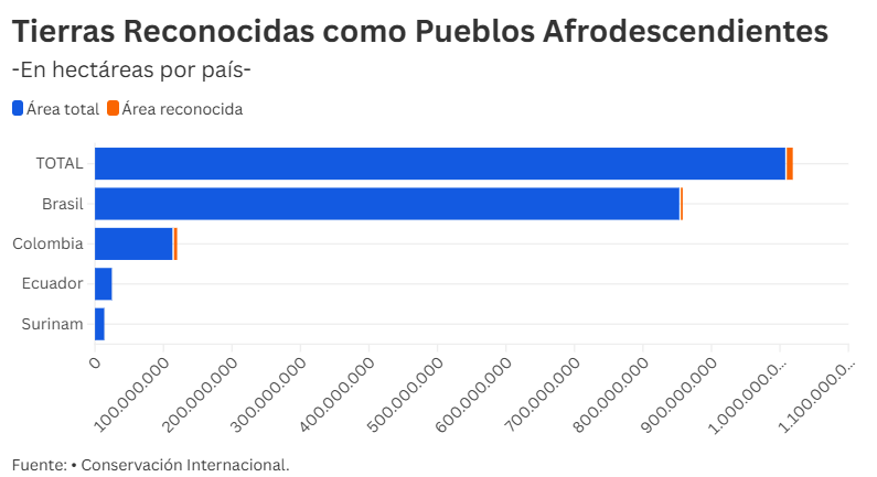 Las tierras reconocidas están expresadas en color anaranjado en el gráfico. Brasil tiene 0,45%, Colombia 5,01%, Ecuador 0,53% y Surinam 1,05%. Las cifras de los dos últimos países, si bien aportan a la suma del 1%, son pequeñas en términos absolutos y no se aprecian en las barras.
