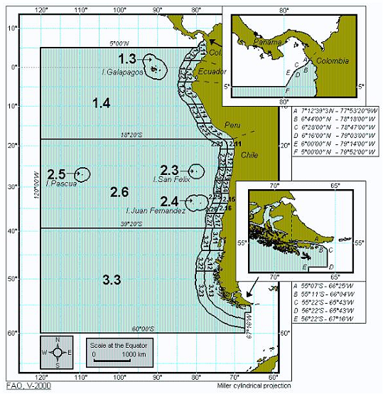 El área especificada de pesca es la EEZ (FAO:87 Pacific Southeast), y dentro de esa área, la 1.4, continental EEZ:
