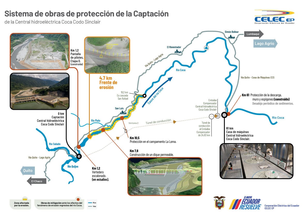 Por lo tanto, “no está el riesgo la infraestructura que permite desviar el agua del río Coca hasta la casa de máquinas de la principal hidroeléctrica del país, con 1.500 MW de potencia instalada”, indicó la Corporación.