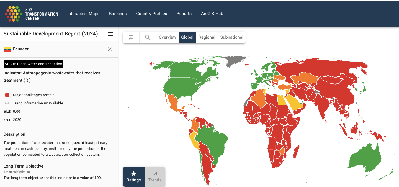 El índice de cumplimiento de Ecuador del sexto de los 17 Objetivos de Desarrollo Sostenible (ODS) 2030: Agua limpia y saneamiento es bajo y se muestra en rojo.