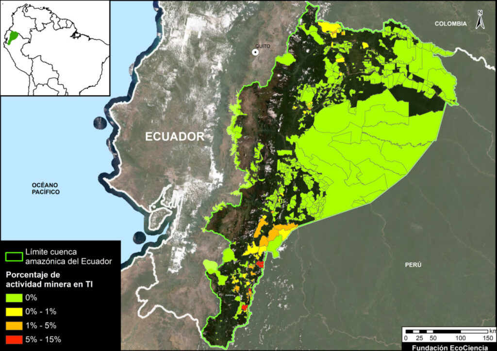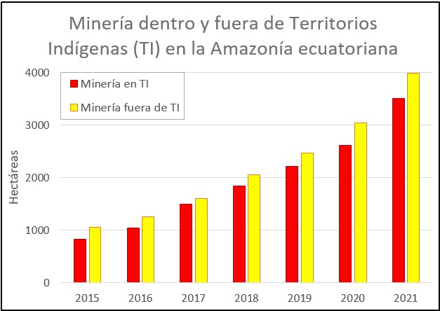 La Figura 1 muestra que casi la mitad (46.7%) de la minería detectada en la Amazonía ecuatoriana se ubica dentro de territorios indígenas.