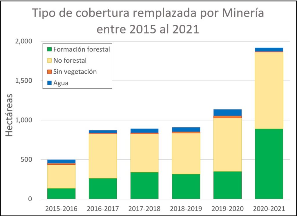 Cabe enfatizar, señala el reporte, en el 2021 las nuevas superficies mineras sobre áreas previamente boscosas (889 hectáreas) se incrementaron a 46%, un valor no alcanzado en ningún periodo anterior.