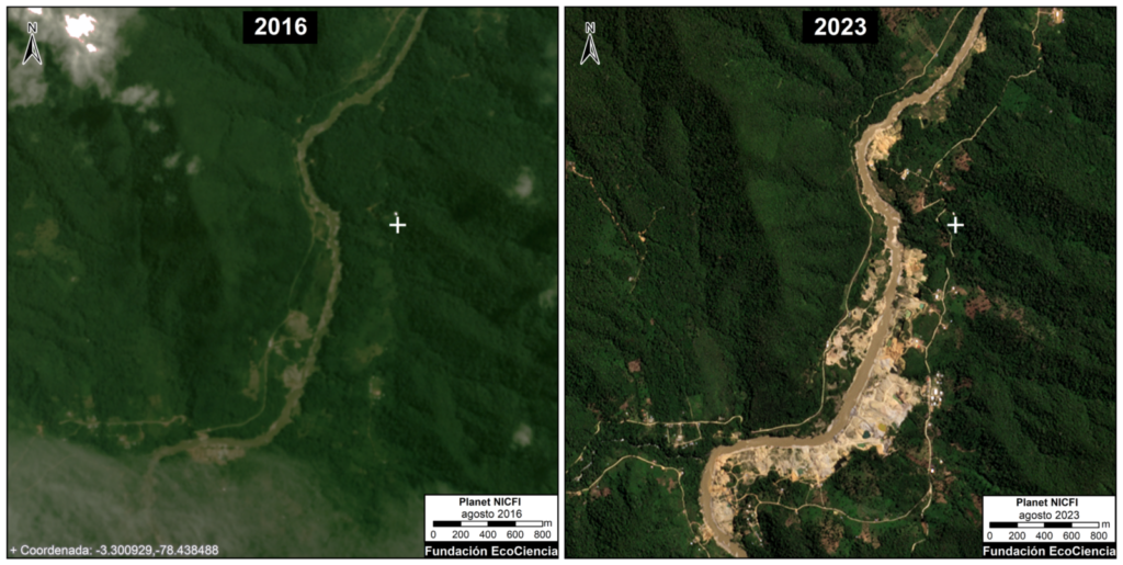 “Este hallazgo indica que la minería ya es una importante causa directa de deforestación. La mayor parte de esa deforestación causada específicamente por minería se dio en la provincia de Zamora Chinchipe (32%), seguida por Sucumbíos (7%)”.