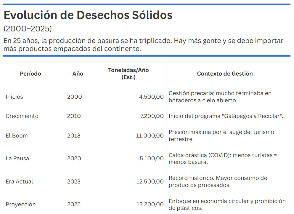 Aunque los centros de reciclaje locales logran recuperar hasta la mitad de los residuos (un hecho extraordinario en el Ecuador), el volumen refleja un cambio profundo en el estilo de vida insular y en la dependencia de productos importados.