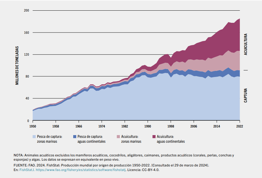 En el siguiente cuadro se refleja el crecimiento de la producción pesquera y acuícola desde 1950 hasta 2022, el año récord. Es notorio el aporte de la acuicultura en zonas continentales y zonas marinas.