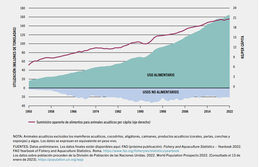 De la producción total de animales acuáticos, el 89% se destina al consumo humano, lo que equivale a unos 20,7 kg per cápita en 2022. El resto tuvo usos no alimentarios, principalmente a la producción de harina y aceite de pescado.