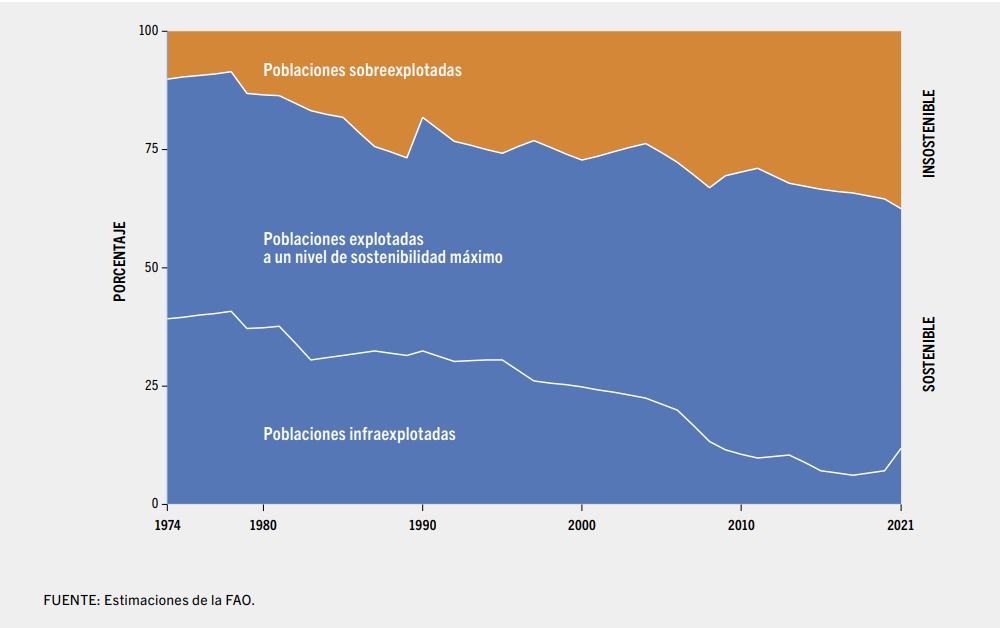 En el cuadro se observa el nivel de explotación de las poblaciones pesqueras y acuáticas según su nivel de explotación. Hay un incremento de las poblaciones sobreexplotadas, entre las que se hallan varias especies de atunes, según la FAO.