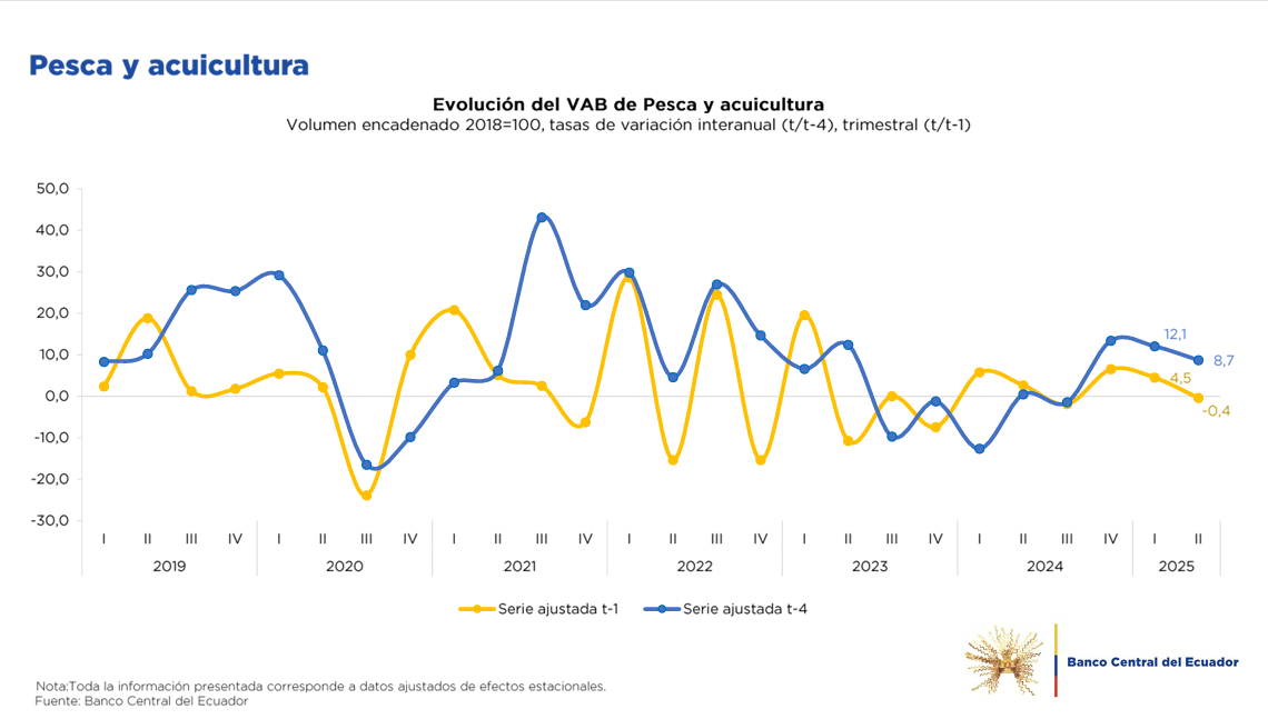 Según datos del Banco Central del Ecuador, hubo una mejora interanual (primer semestre de 2024 y 2025) del 14,9% en el procesamiento y conservación de camarón y de 4,5% en la preparación y conservación de pescado y otros productos acuáticos.