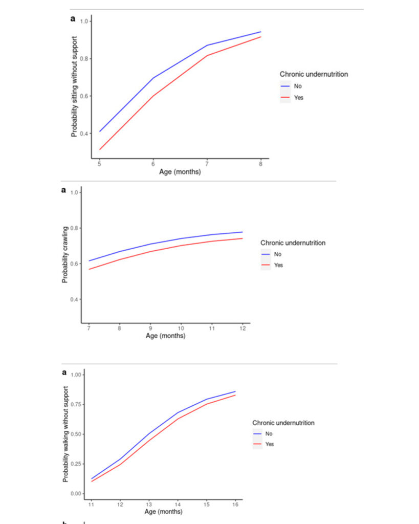 Los expertos estudiaron minuciosamente las edades a las que los infantes logran sentarse, gatear, pararse y caminar con apoyo, y pararse y caminar sin apoyo. Las cifras mostraron que los niños con DCI alcanzan esos hitos del desarrollo más tarde, en comparación con los niños bien nutridos.