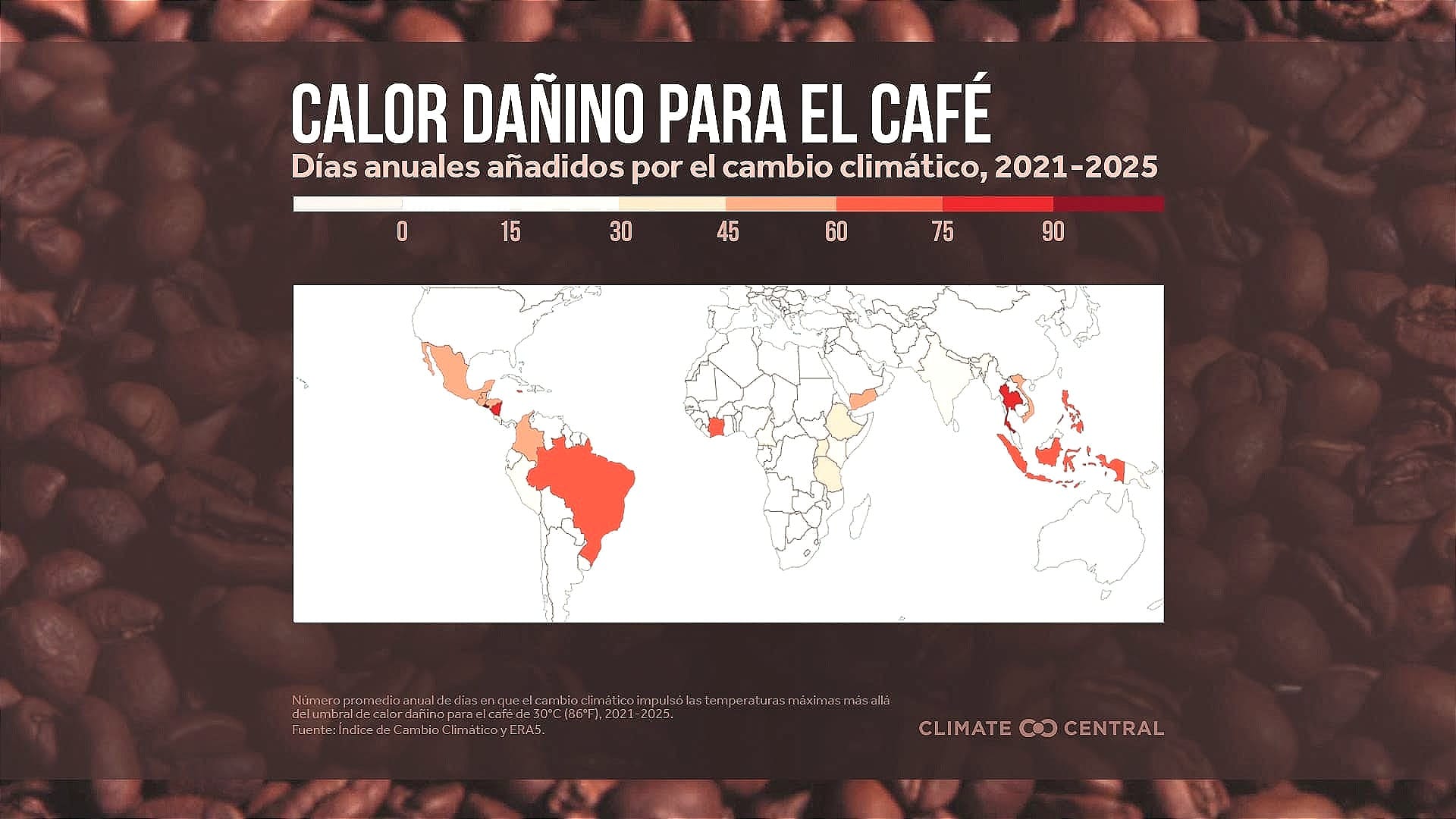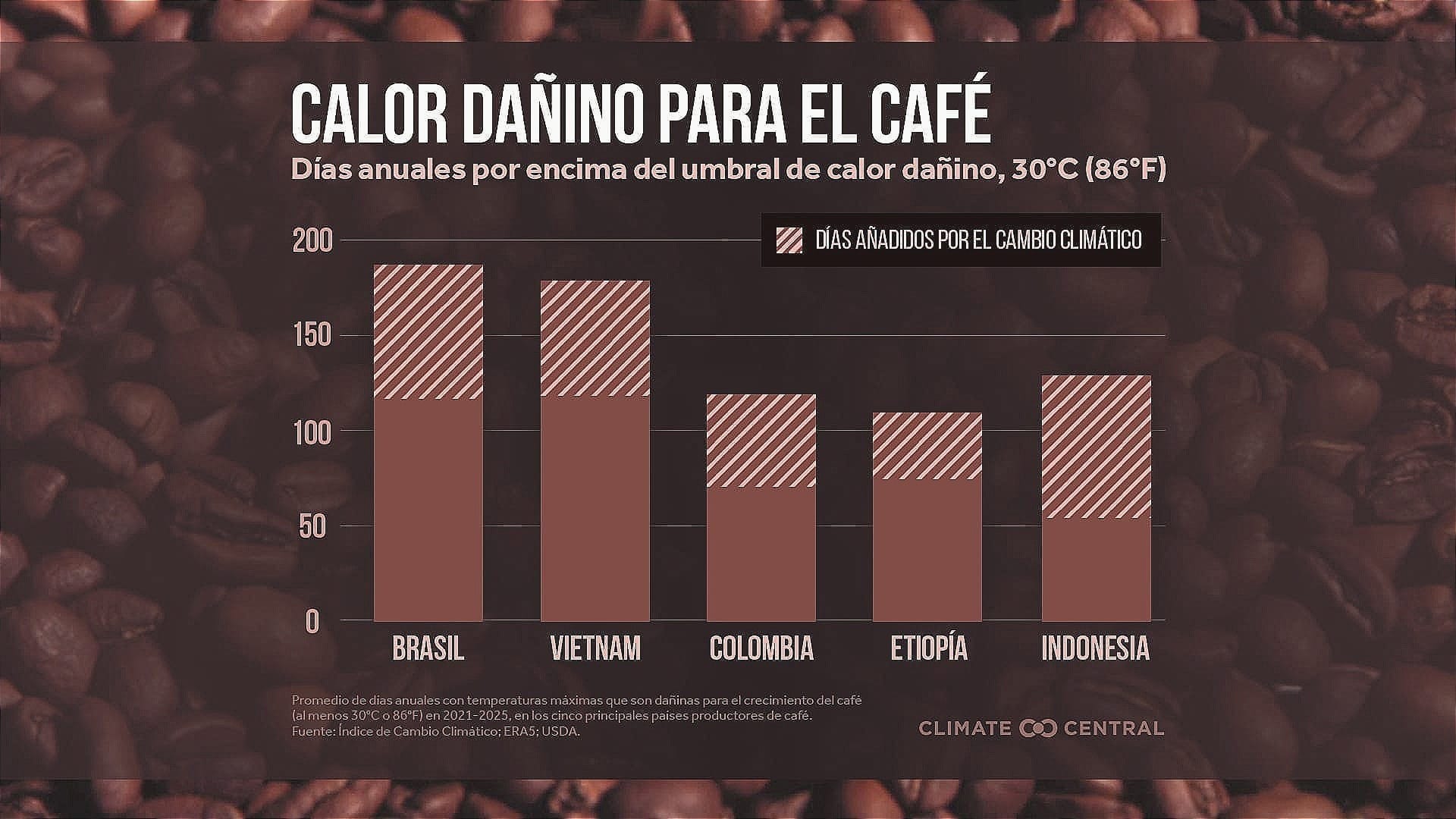 Los 25 países estudiados, que exportan el 97% del café que se consume en el mundo, “experimentaron un promedio de 57 días adicionales anuales de calor dañino para el café debido al cambio climático”.