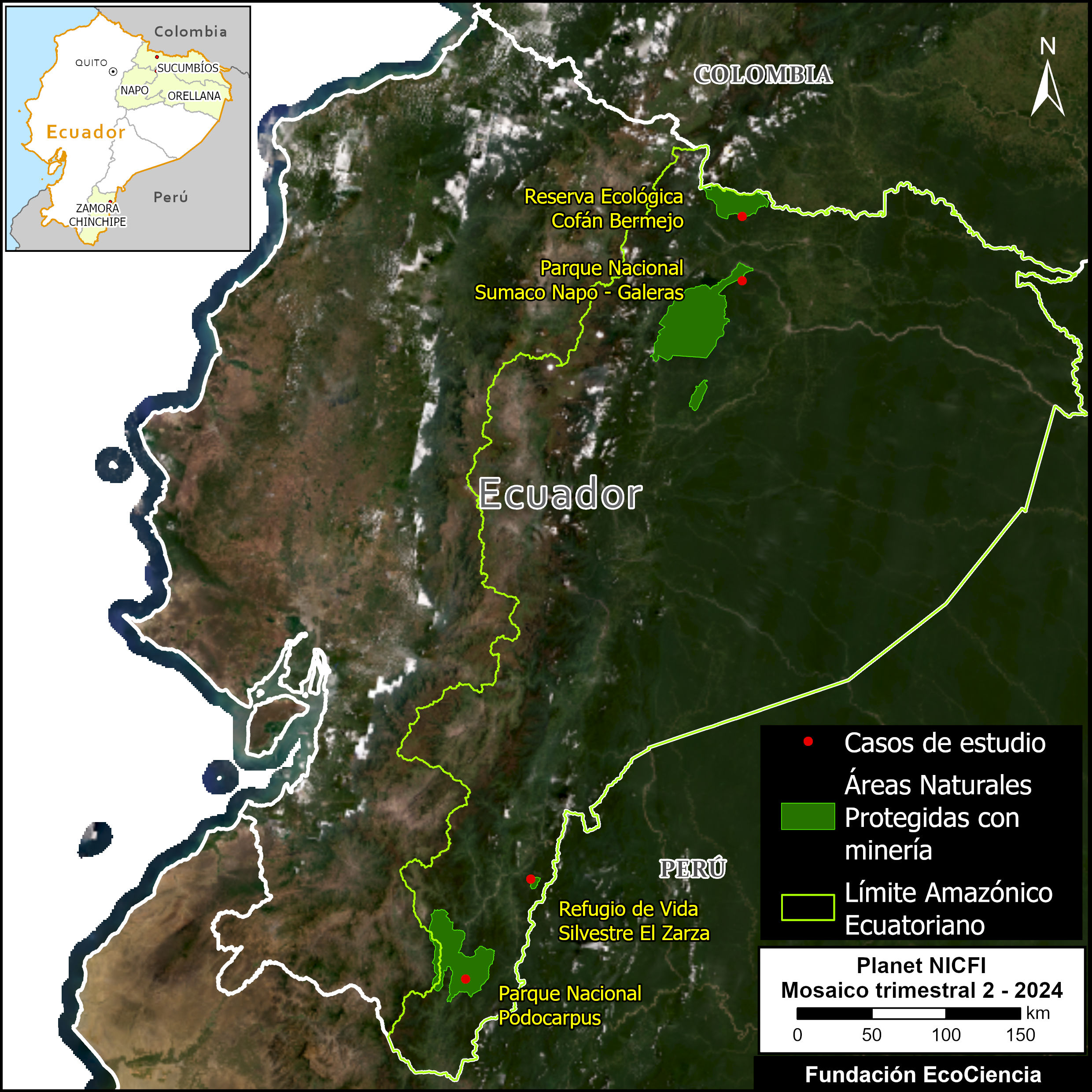 En las otras tres áreas (Sumaco Napo-Galeras, Cofán Bermejo y El Zarza), las actividades mineras no reguladas en sus zonas de amortiguamiento se adentran paulatinamente a las áreas protegidas, señala el estudio.