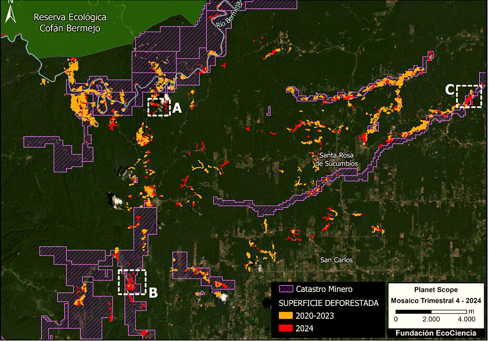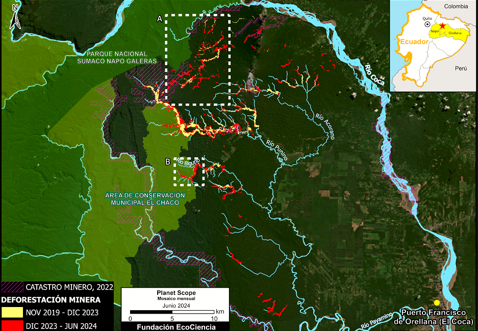 Además, la deforestación minera se está expandiendo activamente dentro de territorios Indígenas de la nacionalidad Kichwa.