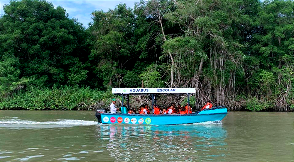 Y dio lugar a comprar una lancha que sale de Caraguay y pasa por las pequeñas comunidades Masa Uno y Masa Dos para transportar a los cuatro profesores y a diez estudiantes de los dos sitios a Punta de Piedra.