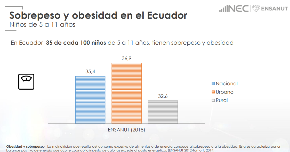 En el caso de Ecuador, no se cuenta con datos abundantes, pero los que existen son preocupantes. Roberto Castillo, ex director del Instituto Nacional de Estadística y Censos (INEC), señaló que la última encuesta en la que se midió y pesó a la población fue la Encuesta Nacional de Salud y Nutrición (Ensanut 2018).