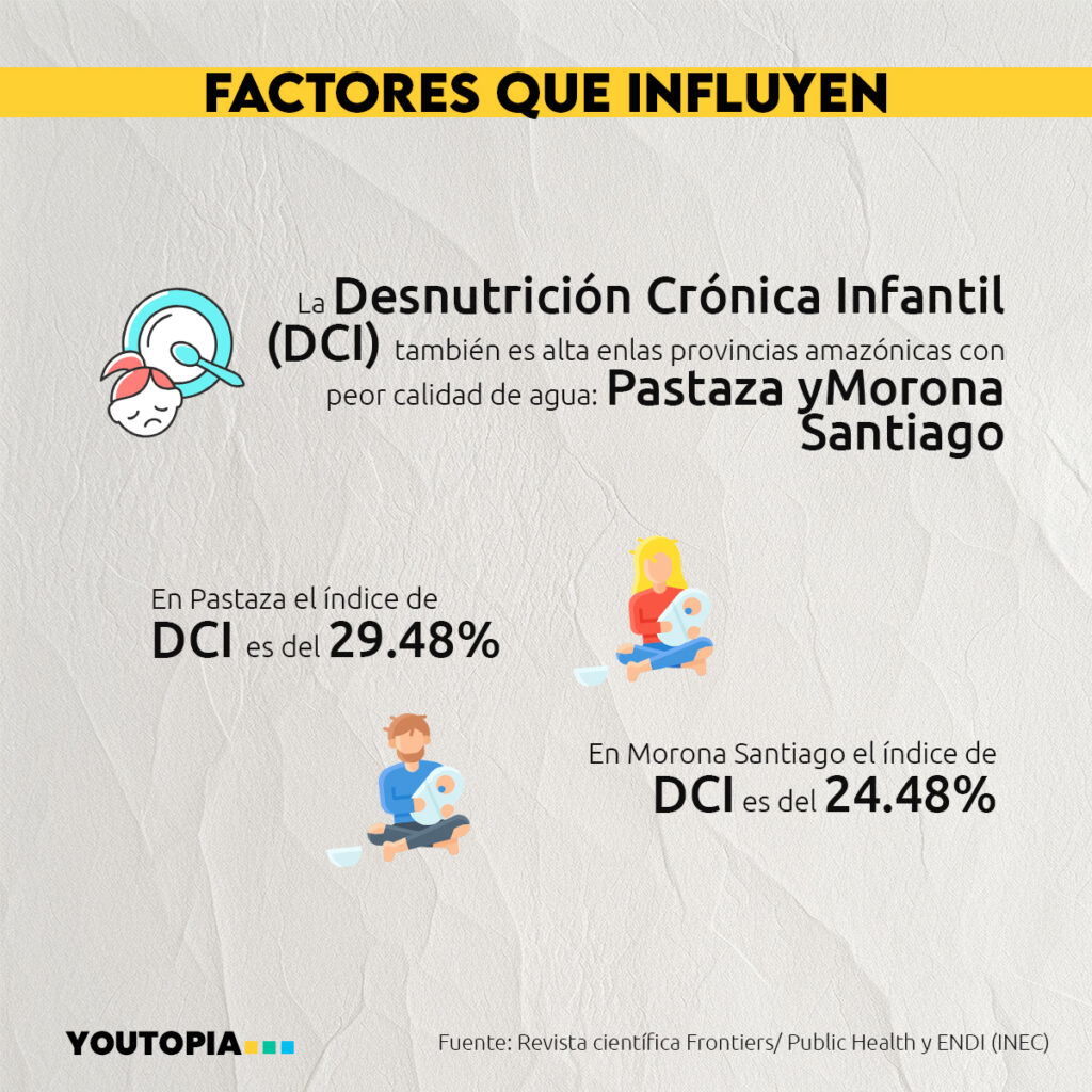 Estas dos provincias son también las que tienen el índice más alto de fuentes de agua contaminadas con heces fecales. Según la Encuesta de Desnutrición Infantil el 70.22% de hogares con niños menores a cinco años consume agua con E. Coli en Morona Santiago, y el 56.93% en Pastaza.