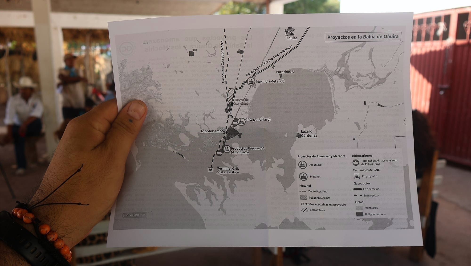 Como parte de GeoComunes, el geógrafo Luis Fernando Pérez investiga sobre megaproyectos para informar a las comunidades y fortalecer su autodeterminación sobre su territorio. Y tras recorrer la bahía de Ohuira señaló que, más que una transición energética, estos proyectos son una nueva forma de división internacional del trabajo, donde a Topolobampo le tocaría proveer al mundo de amoniaco, metanol y gas licuado a costa de la salud de los ecosistemas y comunidades locales.
