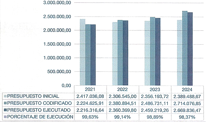 Las últimas de las xx páginas de la Rendición de cuentas están dedicadas a los recursos humanos y económicos. En 2024, la SOT contó con 98 servidores y un presupuesto inicial de USD 2'389.488.67 que se amplió a USD 2'714.076,85, con una ejecución final de USD 2'669.836,47: