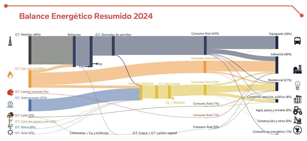En el siguiente cuadro e observa el balance 2024 de la producción y el consumo de Venezuela, donde queda claro que el desarrollo de energías alternativas como la eólica y solar son básicamente del 0%.