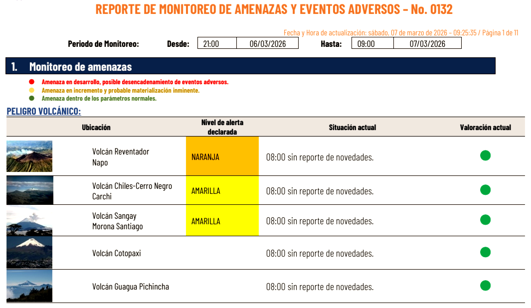 E Reventador, ubicado en la provincia de Napo y aproximadamente a 90 km al este de Quito, experimentó erupciones reportadas entre el 7 y 8 de marzo de 2026. Las autoridades dieron disposiciones para evitar muertes y afectaciones a la salud, así como daños materiales.